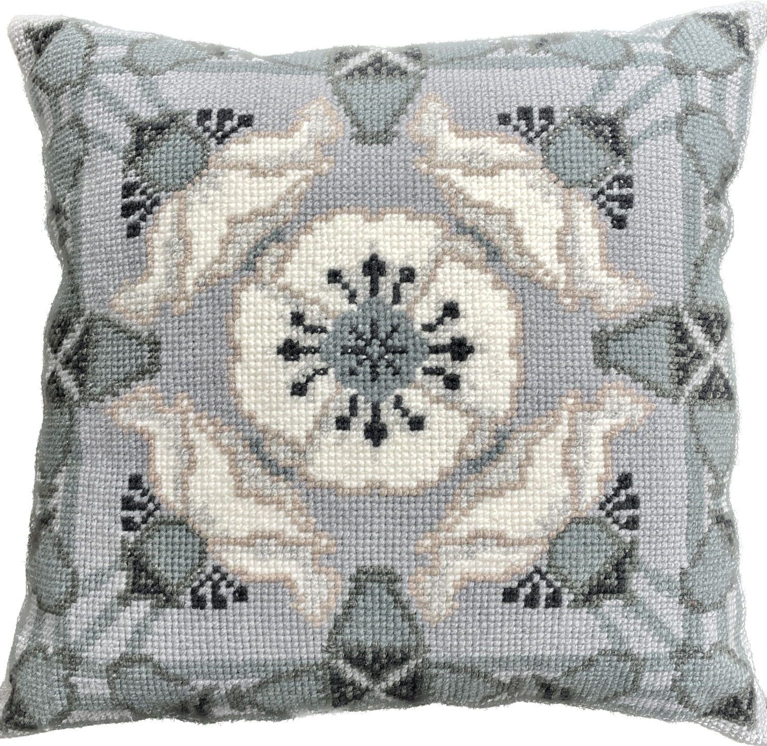 Malvikki-tyyny on ristipistoin kirjailtava tyynynpäällinen, joka myydään kätevänä tee itse-tarvikepakettina. Tyynyn jugend-aiheinen kuvio on Wetterhoffin tekstiiliarkiston mallista vuodelta 1903.