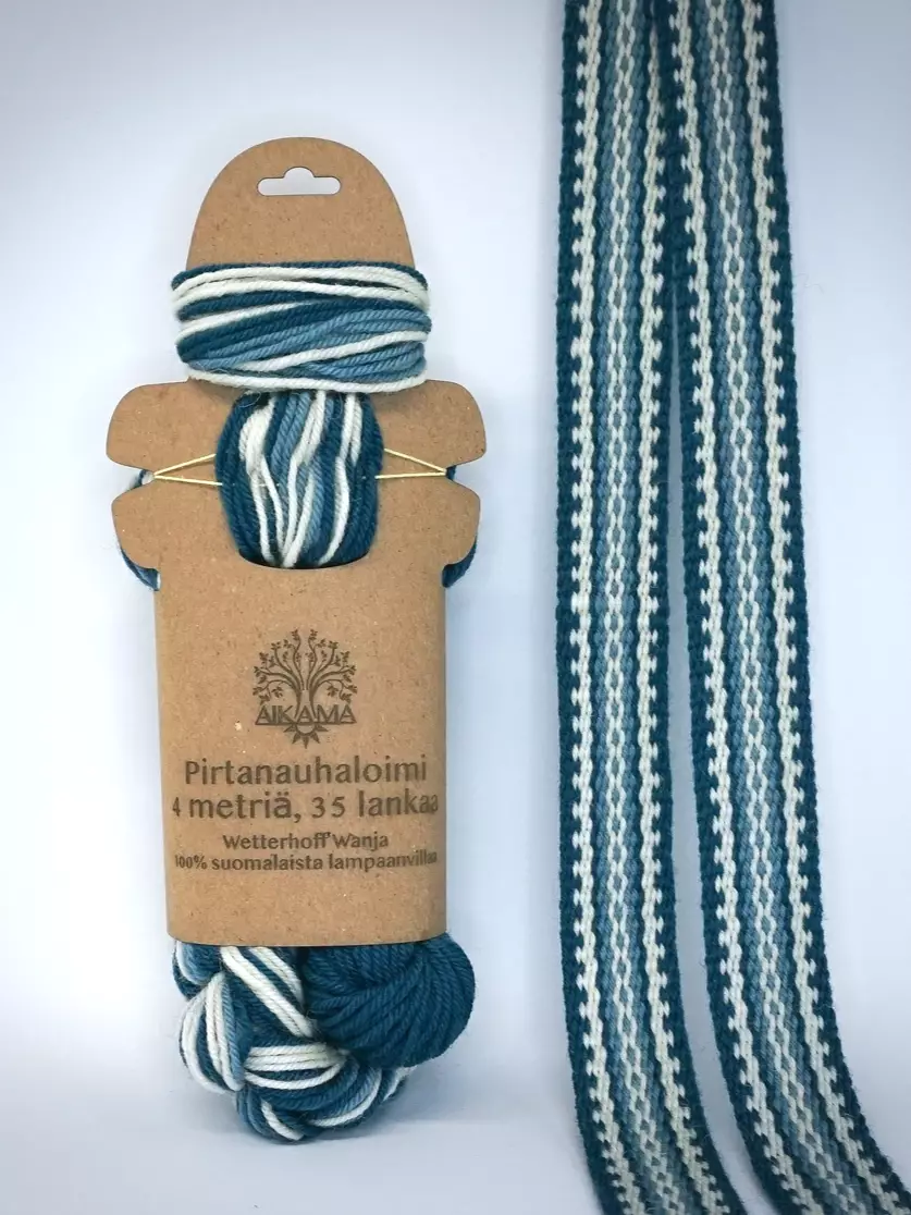 Pakkaus sisältää 4 metriä pitkän pirtanauhaloimen ja kudelangan, joilla kudot 3 metriä pitkän ja 3 cm leveän pirtanauhan.