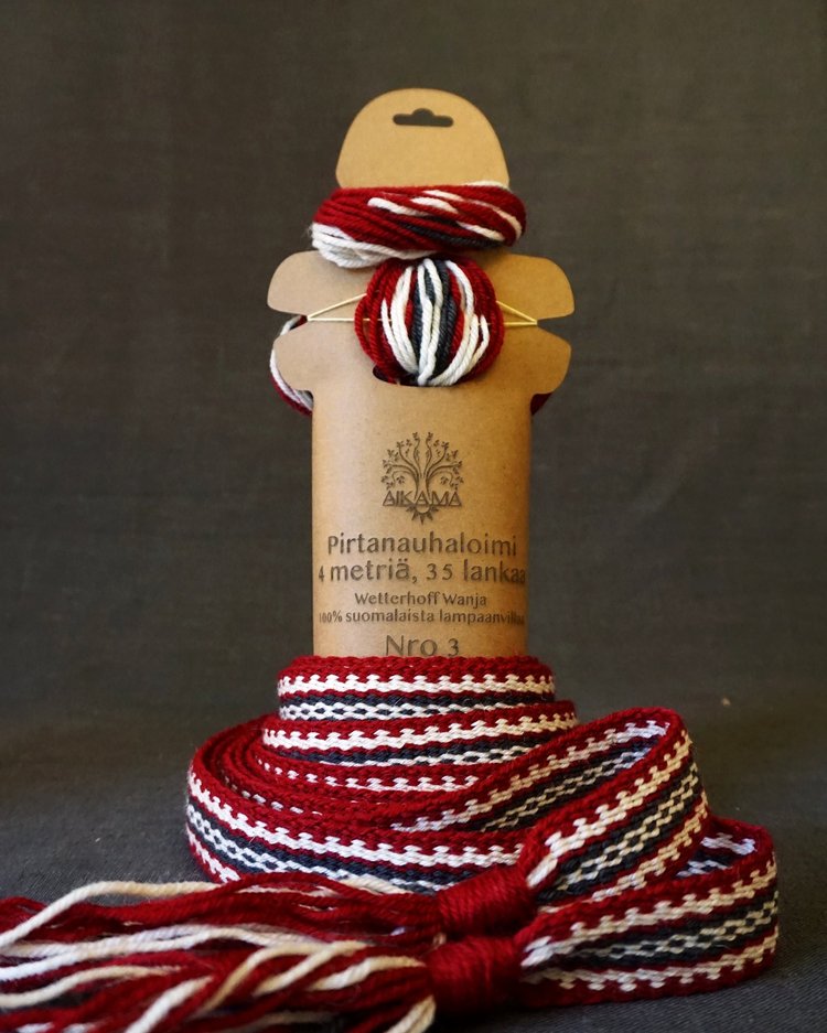 Pakkaus sisältää 4 metriä pitkän pirtanauhaloimen ja kudelangan, joilla kudot 3 metriä pitkän ja 3 cm leveän pirtanauhan.