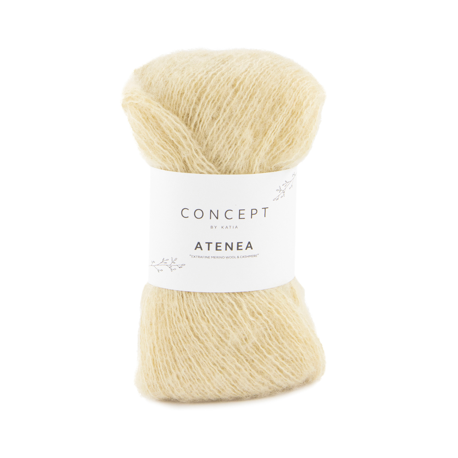Concept by Katian Atenea on laadukkaista materiaaleista koostuva ihanan pehmeä, kevyt ja ilmava lanka. Atenea sisältää neitsytvillaa, egyptiläistä laadukasta mako-puuvillaa ja pehmeää kashmiria. Atenea on ihanteellinen kevyiden ja muodikkaiden vaatteiden neulomiseen, joissa on pehmeä, harjattu tuntuma. Sopii erinomaisesti myös huivilangaksi. Ateneassa on kauniin pehmeät värisävyt. Pitkähihaisen 42-kokoisen neulepuseron menekkiarvio on 7 kerää.