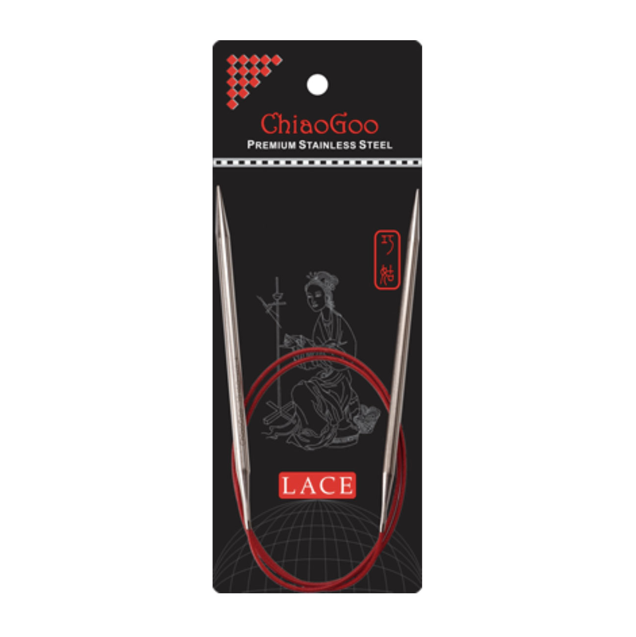 Chiaogoo Red Lace Pyöröpuikot ovat Chiaogoon suosituin tuoteperhe. Nämä erittäin laadukkaat puikot on valmistettu kirurginteräksestä. Kirurginteräs on materiaalina huippulaadukasta ja allergisoimatonta ja takaa puikolle sileän pinnan. Chiaogoo pyöröpuikkojen kaapeli on nailon päällystettyä teräsvaijeria. Teräsvaijeri on taipuisaa, mutta palautuu säilytyksenkin jälkeen suoraksi, minkä ansiosta et joudu ongelmiin kiertyneen kaapelin kanssa. Niin puikkojen kuin kaapelinkin ansiosta neule liikkuu sujuvasti ja työskentely on mukavaa.