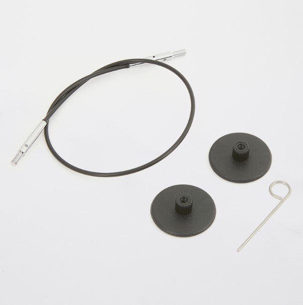 KnitPro vaihtokaapeli on tarkoitettu KnitPro pyöröpuikkojen vaihtopäiden kanssa käytettäväksi. Kaapeli on valmistettu kestävästä ja joustavasta materiaalista ja siinä on sileä liitoskohta. Pitkä kierreruuvi takaa että kaapeli ja puikot pysyvät hyvin kiinni. Mukaan tulee myös kiristysavain sekä silmukkastopparit, jotta voit jättää keskeneräisen työn kaapelille jos haluat irroittaa puikot. HUOM: 40 cm kaapeli soveltuu käytettäväksi vain lyhyiden vaihtopäiden (10cm) kanssa.