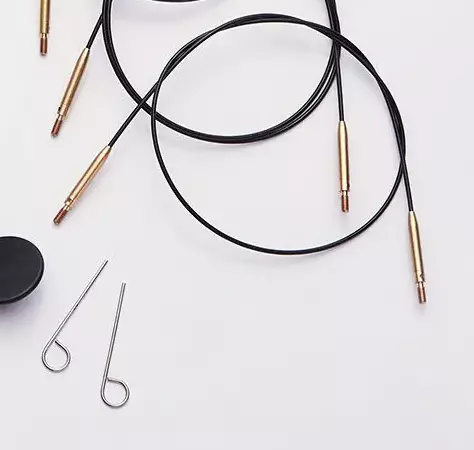 Kaapelin mukana pakkauksessa on päätykappaleet ja kaapeliavain kärkien kiristämiseen. Pyörivät kaapelit sopivat kaikkiin KnitPron vaihdettaviin puikkoihin ja afganistanilaisiin/tunisialaisiin virkkuukoukkuihin.