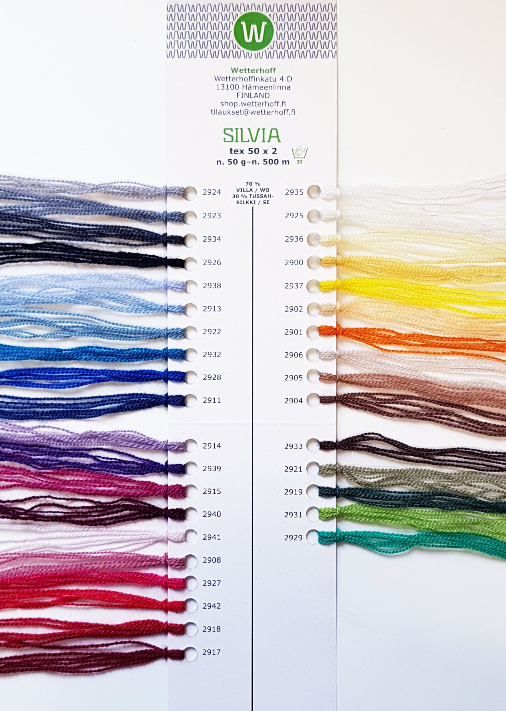 Värien ja materiaalin valinta helpottuu tilaamalla Wetterhoff Silvia - lankakartan. Lankakartta sisältää aidon lankamallin jokaiseen Silvian väriin.