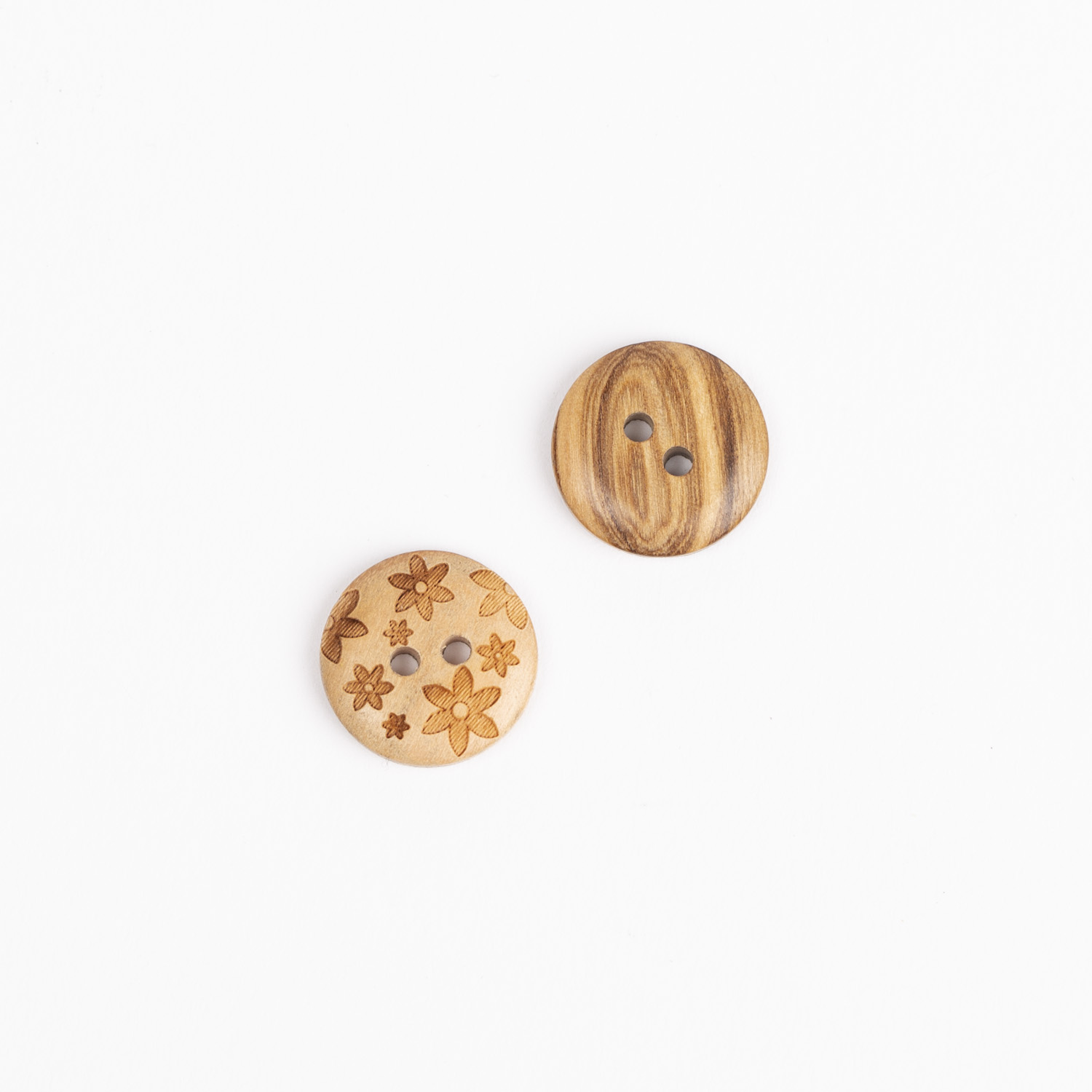 Koristeelliset napit oliivipuusta, joissa kaiverrettu kukkakuvio. Kestävät ja perinteiset napit oliivipuusta, joissa on kaunis puurakenne. Napit valmistetaan aidosta puusta, joten jokainen nappi on ainutlaatuinen, ja nappien väreissä ja rakenteissa on luonnollisia vaihteluita.