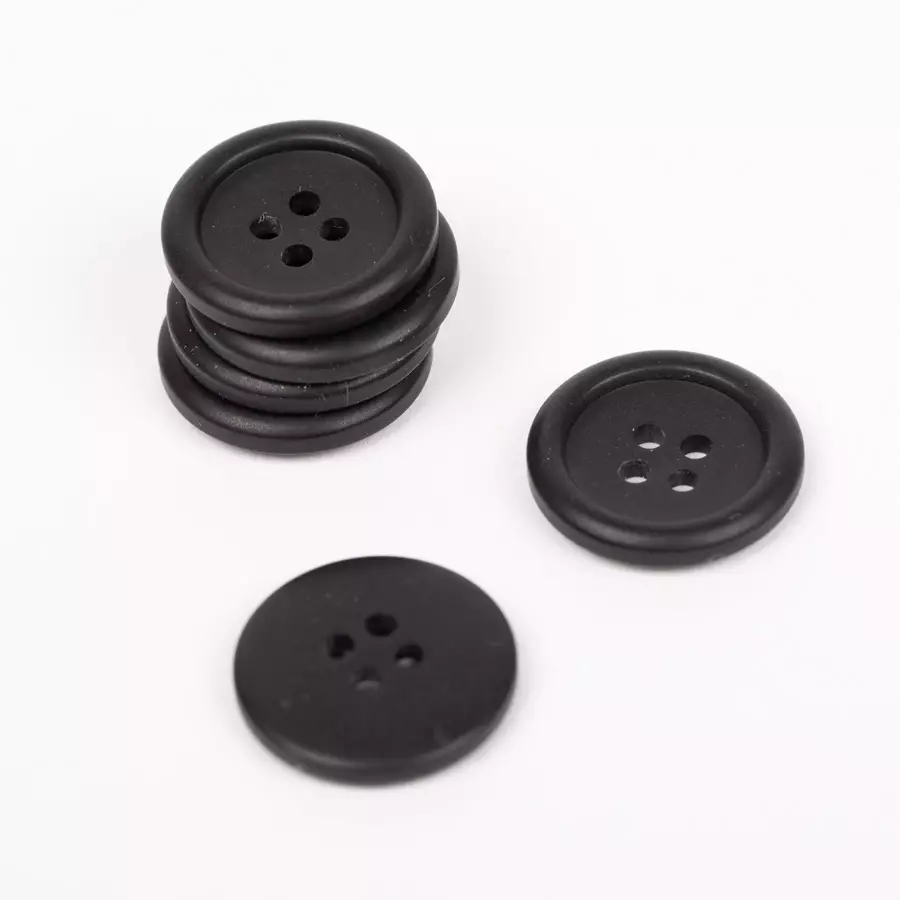 Mattapintainen pyöreä musta 18 mm nappi pehmeällä reunalla. Klassinen muotoilu, väriltään matta musta. Materiaali kestävää polyesteria.