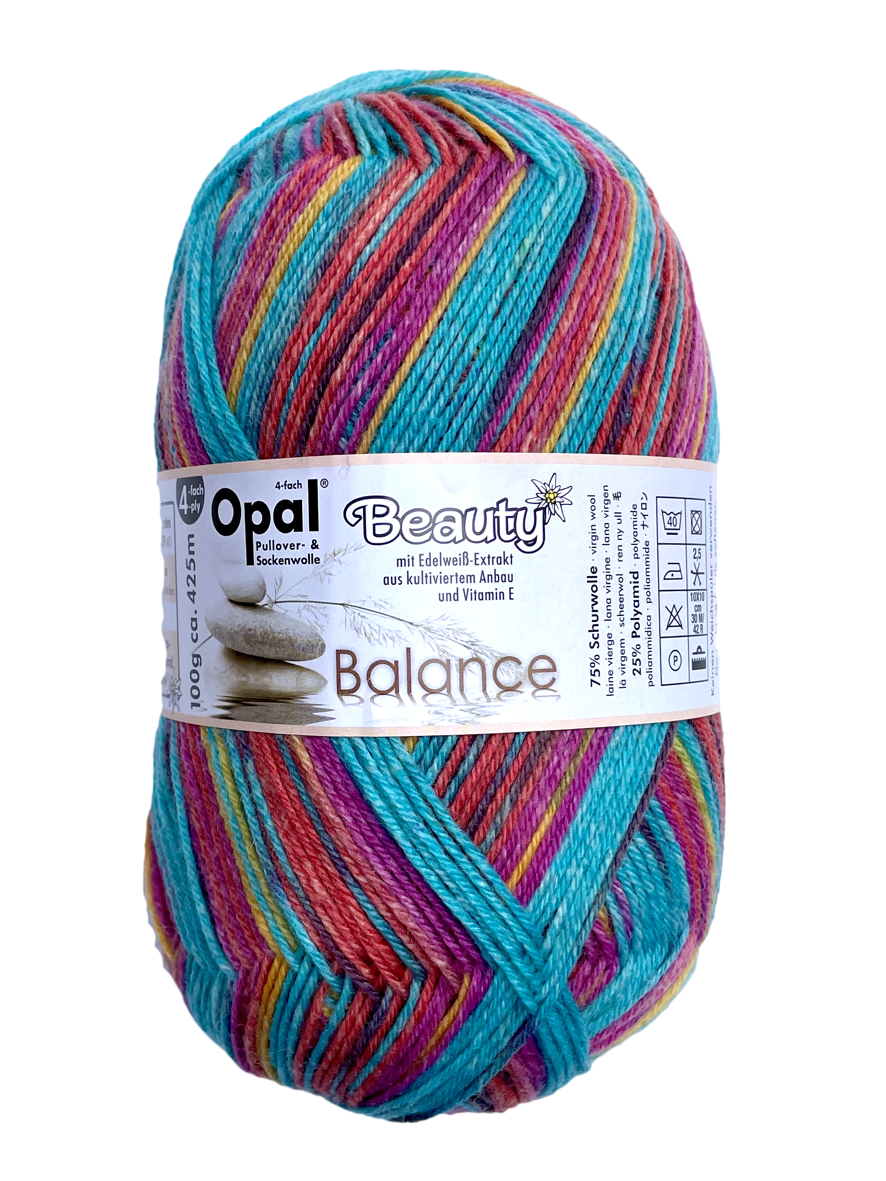 Opal Beauty Balance on 4-säikeinen kestävä ja laadukas sukkalanka. Langan väritys luo neuloessa itsestään raidoittuvan kuvion. Opal Beauty Balance -lanka on käsitelty alppitähtiuutteella ja siihen on lisätty E-vitamiinia, joiden vaikutus tekee langasta pehmeän ja miellyttävän niin neulojalle kuin käyttäjällekin.