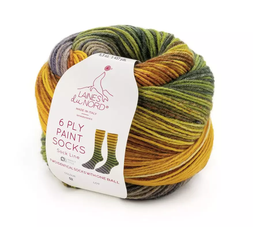 Laines du Nord 6 PLY Paint Socks on ihanan pehmeä, kauniisti raidoittuva merinovillalanka kaikenlaisiin neuleisiin. Ihanteellinen huivi- ja paitalanka, joka sopii mainiosti myös lasten neuleisiin ja sukkiin. Muhkea, 150 g kerä, josta saa sukat identtisellä raidoituksella. Konepestävä lanka.