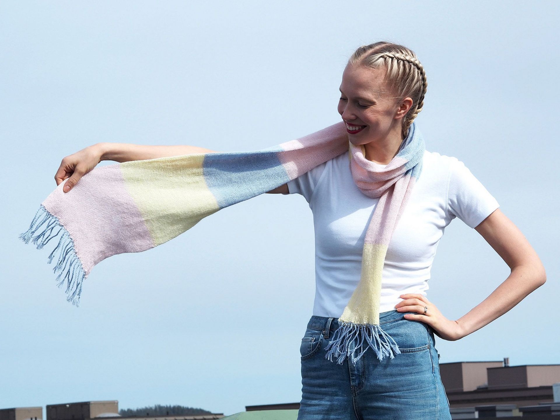 Tarvikepaketti, josta valmistuu helppo, kesäinen ja ihanan pehmeä silkkivillainen kaulahuivi hapsuilla. Huivi neulotaan putkena kolmella eri värillä Wetterhoffin superpehmeästä silkkivillalangasta.