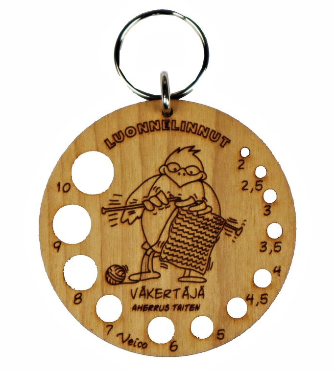 Puinen puikkomitta avaimenperä on kätevä apu neulojalle mittaamaan neulepuikkojen paksuudet. Petri Törmäsen suunnittelemat Luonnelinnut paljastavat ihmisten luonteita ja piirteitä osuvan huvittavasti.