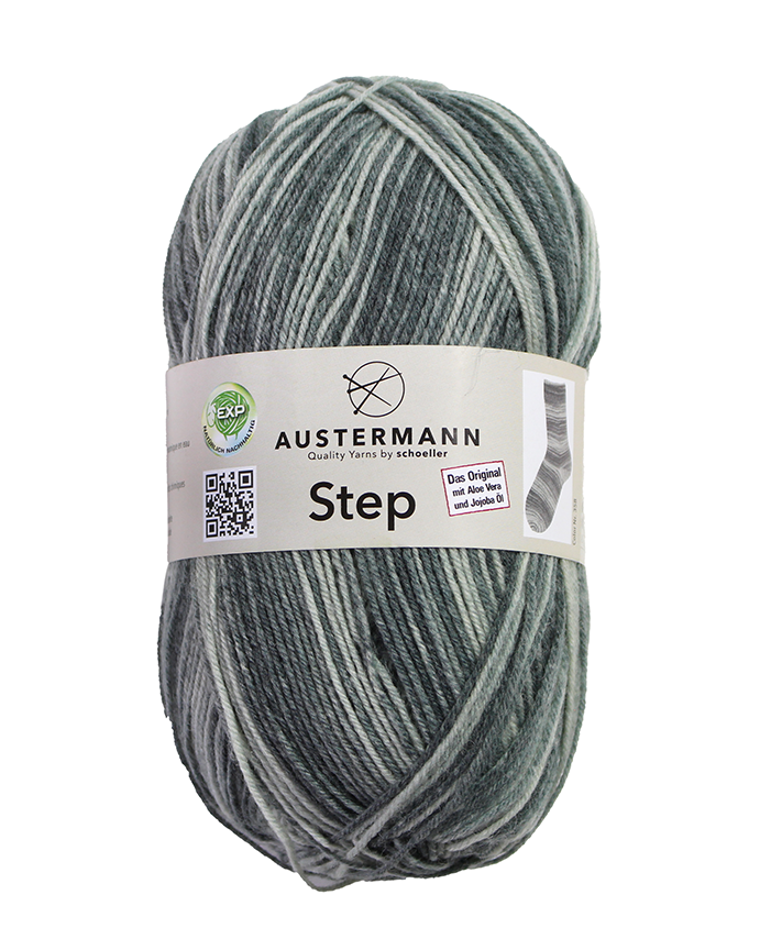 Austermann Step on ohut ja laadukas sukkalanka monenkirjavissa väreissä. Step -sukkalangasta saat kauniit raidalliset sukat. Lanka on käsitelty Aloe Veralla ja Jojobaöljyllä. Käsittelyn ansiosta valmiit tuotteet ovat miellyttävän tuntuisia käyttää ja näin ollen soveltuvat hyvin myös herkkäihoisille. Yksi kerä riittää sukkapariin jopa 46 koossa. Lanka soveltuu loistavasti myös muihin asusteisiin ja neuletakkeihin.