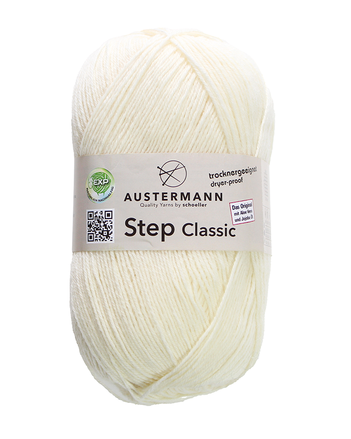 Austermann Step Classic on laadukas yksivärinen ohut sukkalanka. Lanka on käsitelty Aloe Veralla ja Jojobaöljyllä minkä ansiosta valmiit tuotteet ovat miellyttävän tuntuisia käyttää ja näin ollen soveltuvat hyvin myös herkkäihoisille. Yksi kerä riittää sukkapariin jopa 46 koossa. Lanka soveltuu loistavasti myös muihin asusteisiin ja neuletakkeihin.