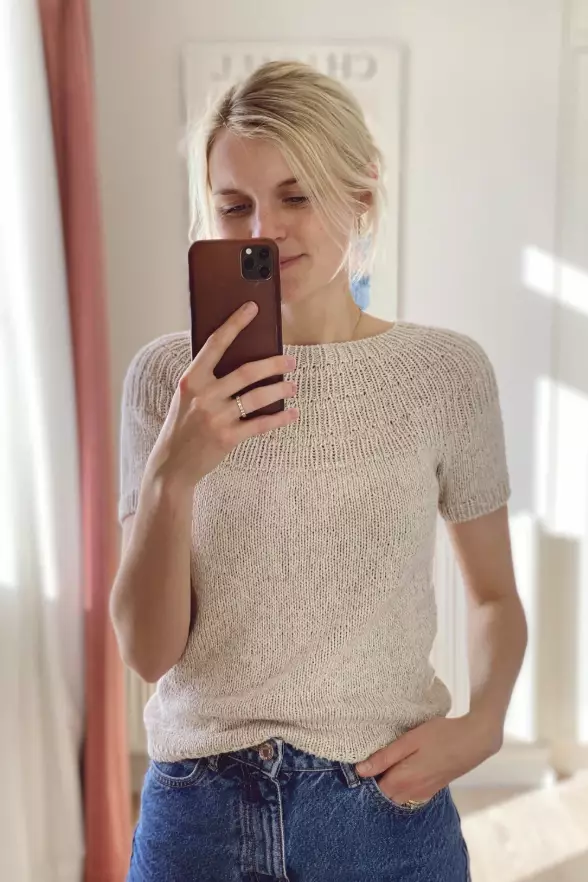 Kuvassa vaalean paidan väri on Sandnes Garn Line, Kitti 1015.