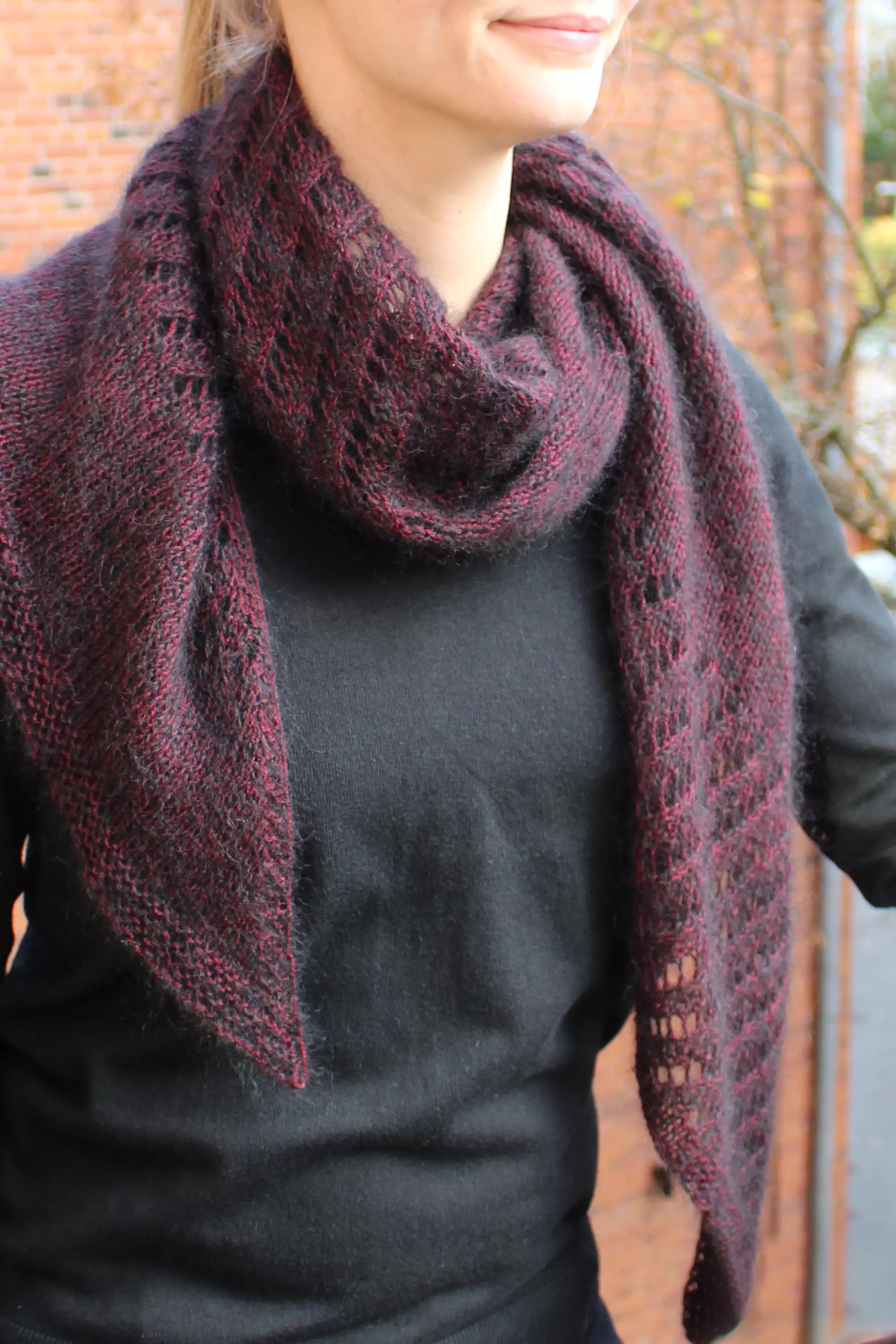 Ylellisen kaunis ja pehmoinen huivi neulotaan kaksinkertaisena yhdistämällä ohut kampa- tai silkkivilla ja mohairlanka. Huivissa toistuu leveä yksinkertainen pitsiraita. Huivi on suunnikkaan mallinen. Yhdistele oma mieluinen väriduo laajasta valikoimasta.