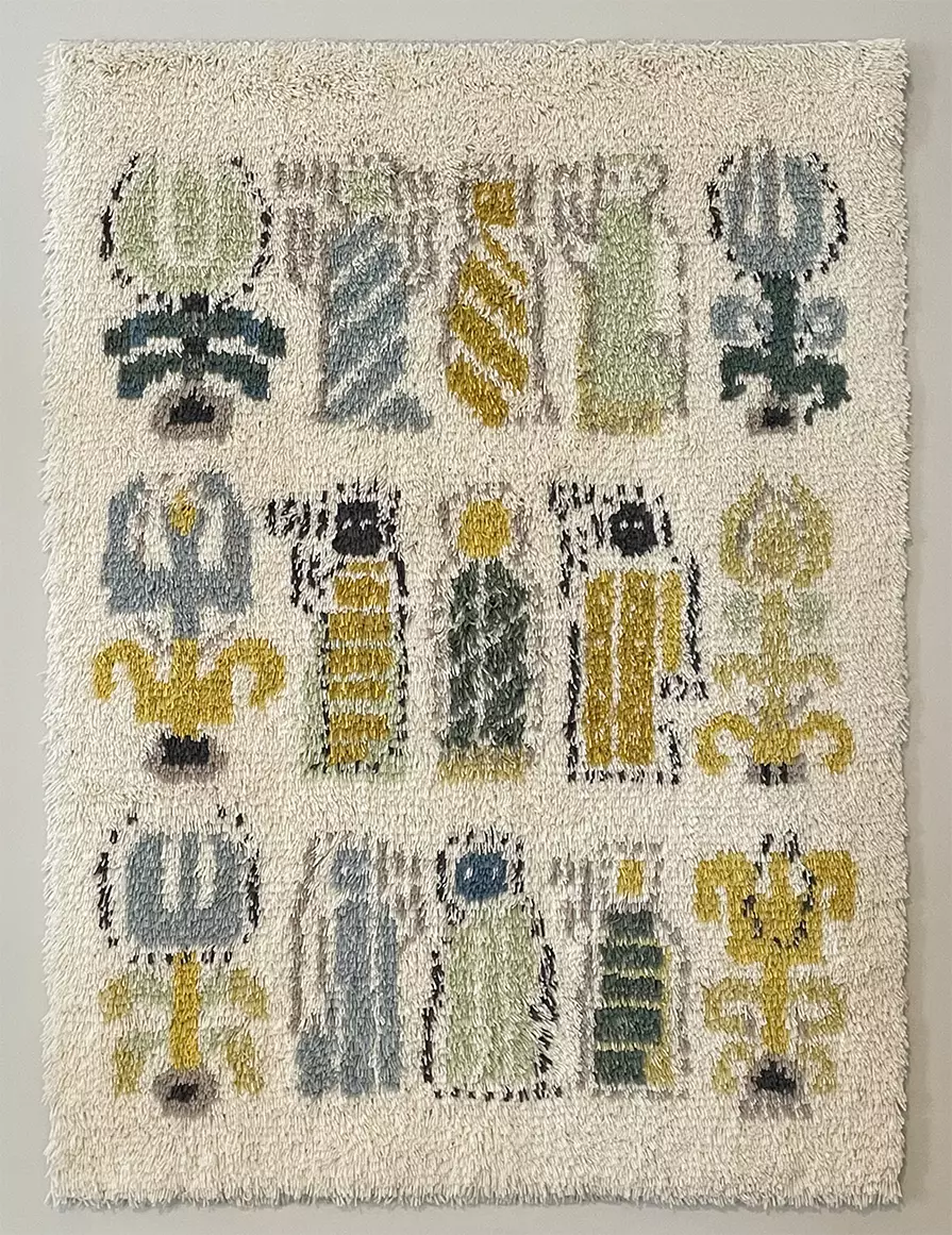 Kaunis, ajaton ja rauhallinen ryijy. Viitteelliset hahmot ja kuviot antavat oman mielen täydentää ryijyn tarinaa.