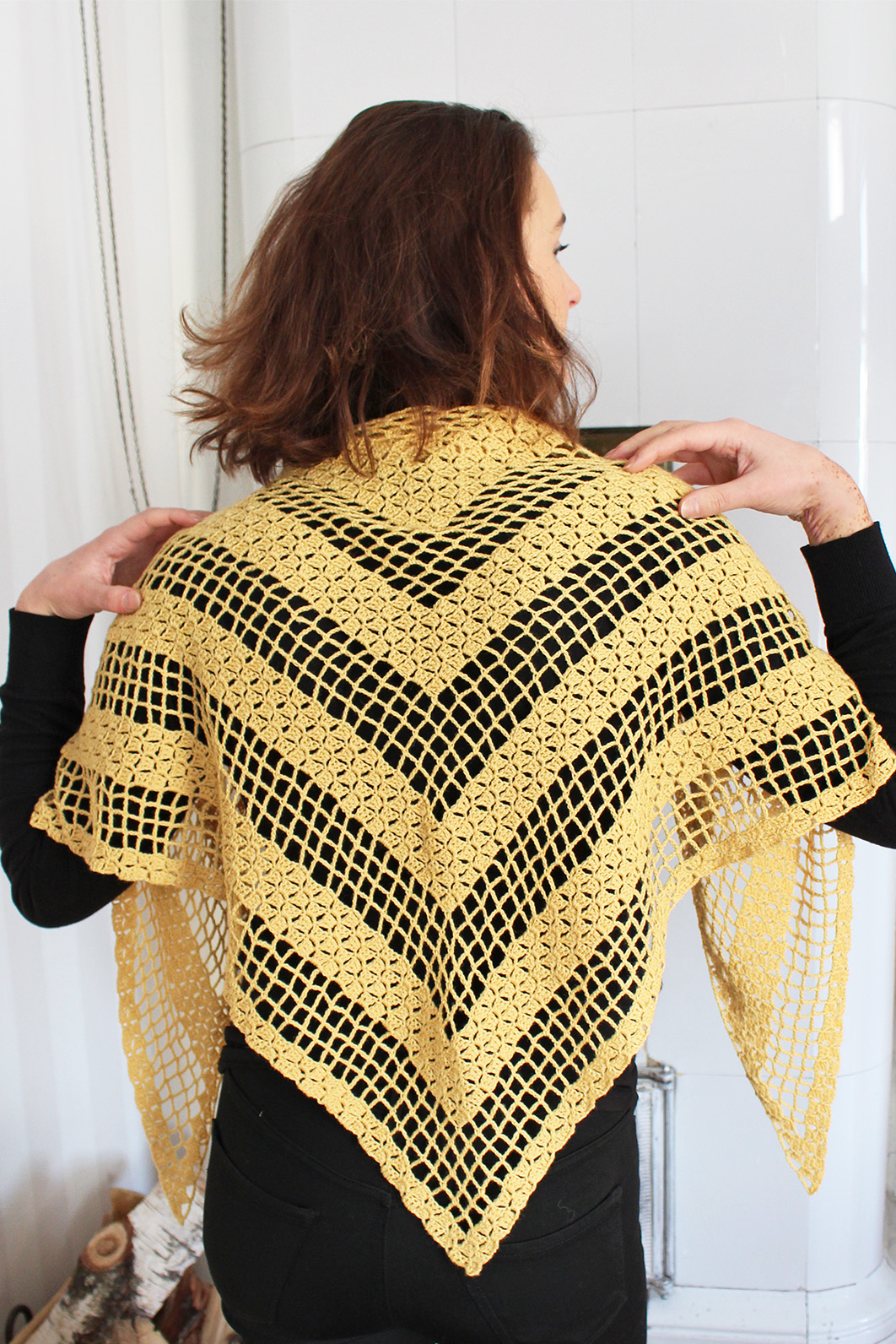 Virkkauspaketti kauniiseen kolmiohuiviin. Paketti sisältää ohjeen ja langat keltaisen väriseen huiviin. Lankana ihanan pehmeä Wetterhoffin Sivilla - silkkivillalanka. Valmiin huivin pitkä sivu on kooltaan n. 140 cm ja korkeus n. 60 cm.